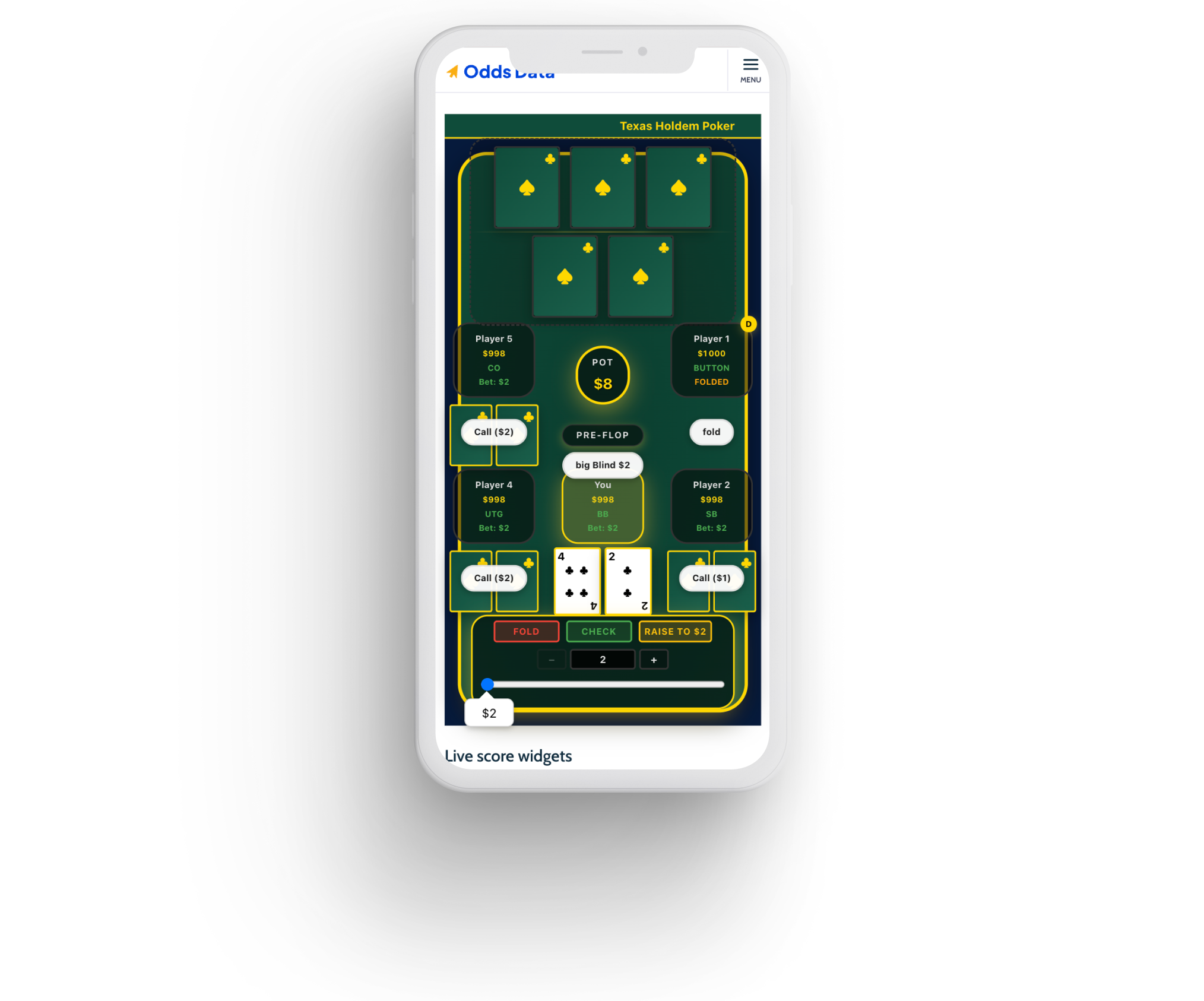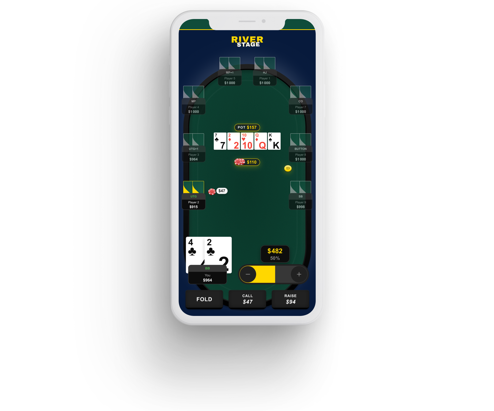 Card suit symbols (♣/♠) indistinguishable at small sizes, dev team compensated by oversizing cards, consuming vertical space needed for player seats. Yellow borders on every element destroyed visual hierarchy. Player modules displayed all info (name, stack, position, bet) at equal typographic weight, no scan path. Stage indicator buried in the layout. Bet amounts displayed as text labels inside player modules instead of poker chip tokens on the table surface.