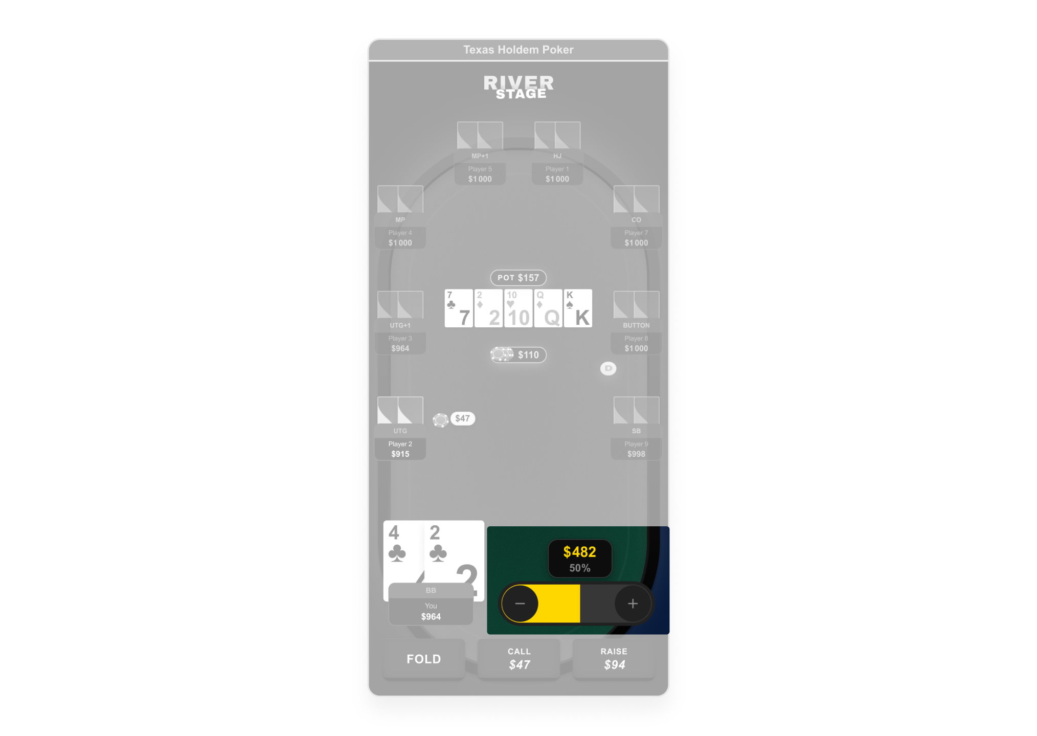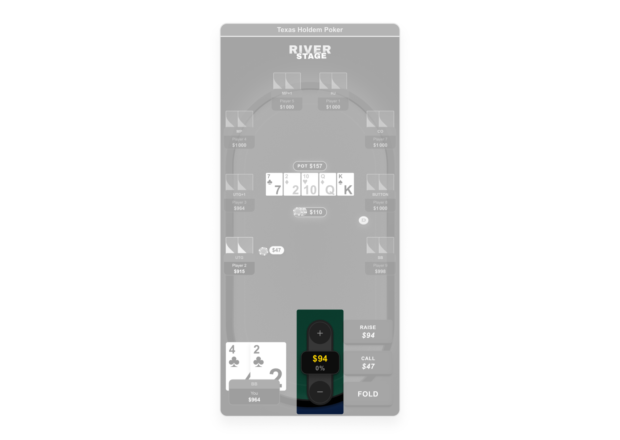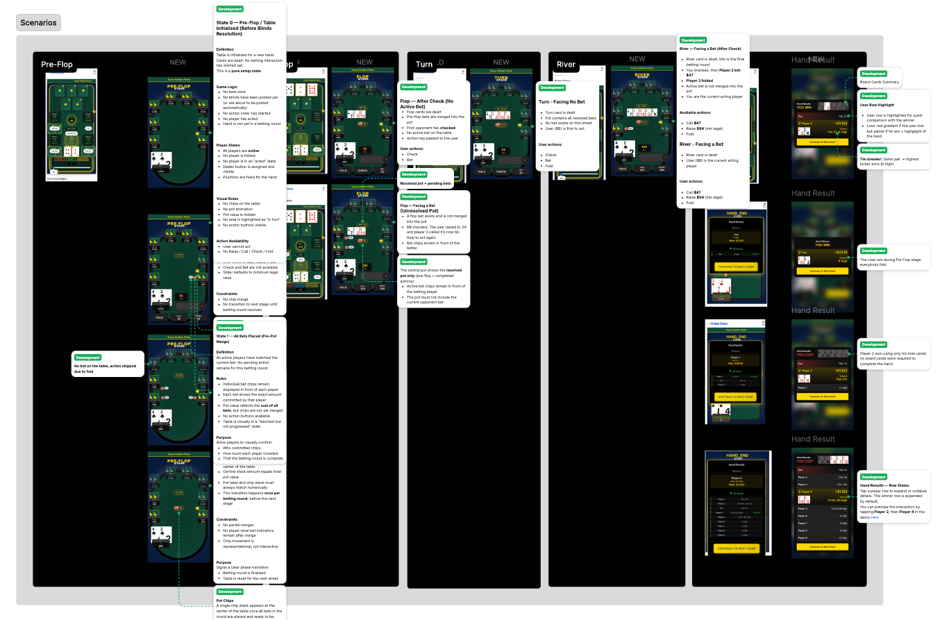 Mapped every game state against Texas Hold'em rules: pre-flop, flop, turn, river, showdown. Defined explicit action availability rules per state: which buttons are active, which are disabled, and why. Flagged all production errors formally to the PM — each described as a user-facing credibility risk, not a design issue. Built and documented a complete scenario strip (Pre-Flop → River → Result) to validate component placement at every game stage.