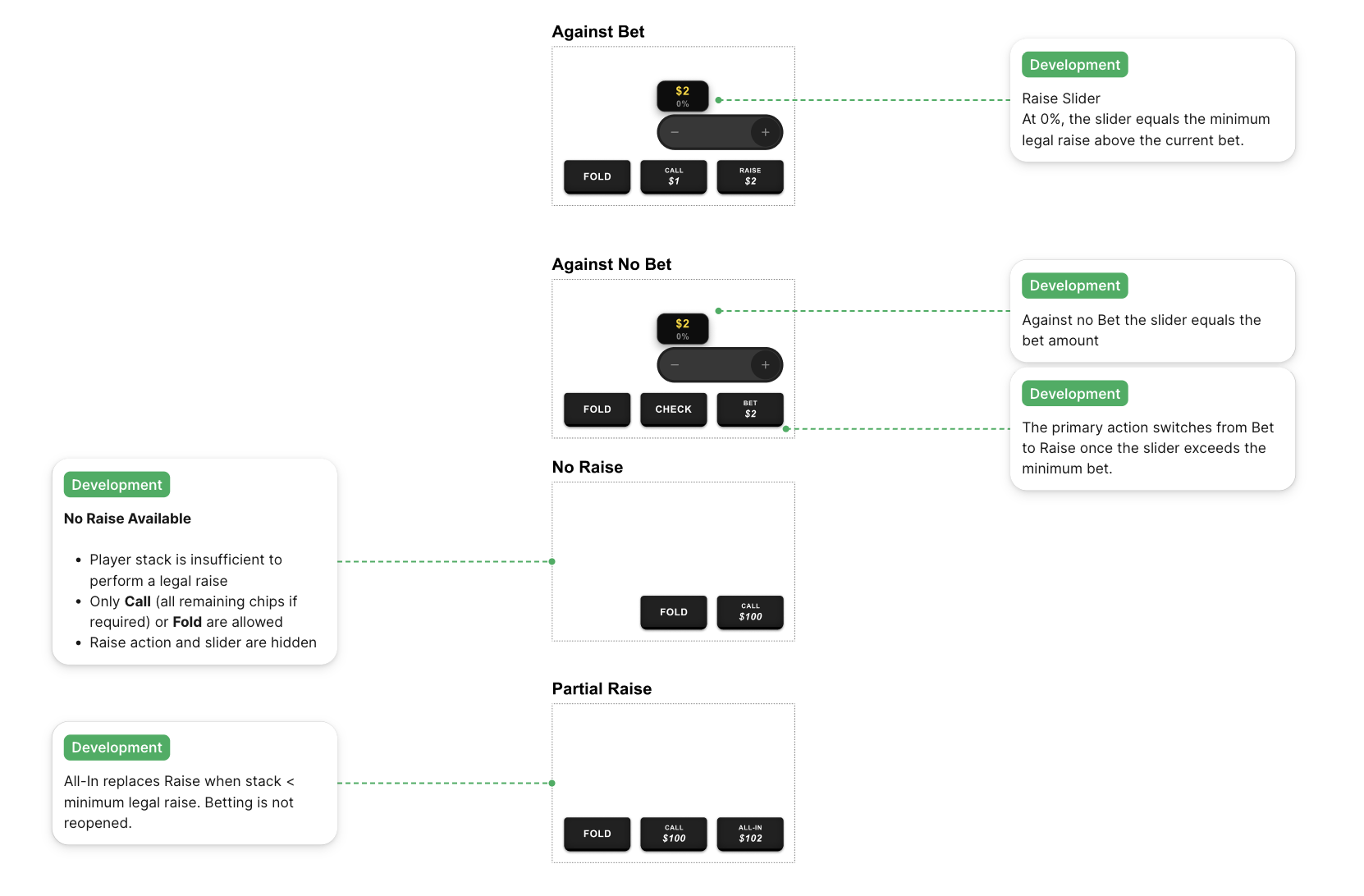 Documented all 4 action panel configurations: Against Bet (Fold/Call/Raise), Against No Bet (Fold/Check/Bet), No Raise (Fold/Call only), Partial Raise/ALL-IN (Fold/Call/All-In). Each maps to an exact game condition. Dev team implements a state lookup, not a chain of assumptions. Validated across all game states in the scenario strip. Behaviour prototyped as an interactive Figma spec devs see the exact label switch moment, not just the rule.