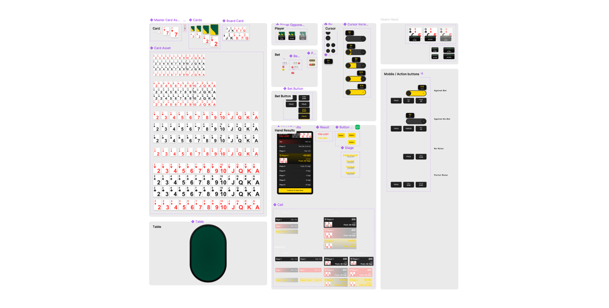 Redesigned full component library: higher-contrast card system legible at 9-player worst-case, betting tokens matching industry-standard poker chip metaphors, player modules with all states defined (default, active, folded, all-in, winner), full modal system for hand results and transitions. All components in a single Figma section with explicit usage rules for engineering.
