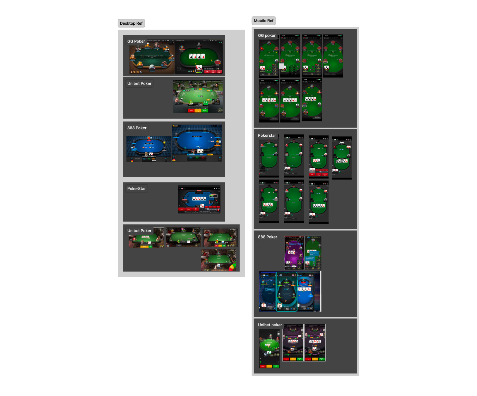 Conducted a structured competitive audit across 4 market leaders on both mobile and desktop: GG Poker, PokerStars, 888 Poker, Unibet Poker — capturing 26+ screens. Key findings extracted per competitor: GG Poker (largest action buttons, clearest pot hierarchy), PokerStars (strongest card legibility, most consistent seat scaling), 888 Poker (most explicit bet labelling), Unibet (best fold/call/raise colour coding). Compiled as persistent Figma reference pages for the full team. Every subsequent design decision backed by at least one benchmark reference.