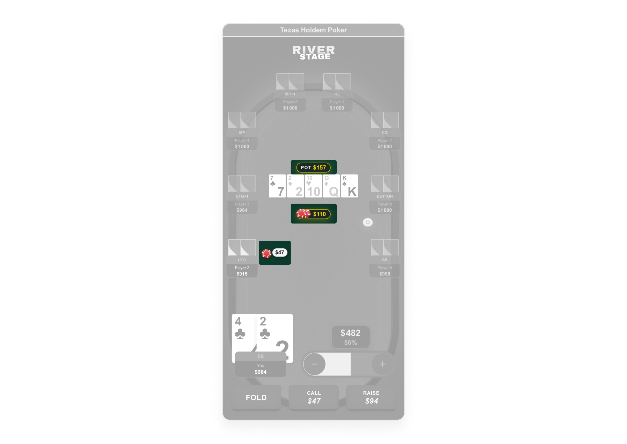 Mapped every game state against Texas Hold'em rules: pre-flop, flop, turn, river, showdown. Defined explicit action availability rules per state: which buttons are active, which are disabled, and why. Flagged all production errors formally to the PM — each described as a user-facing credibility risk, not a design issue. Built and documented a complete scenario strip (Pre-Flop → River → Result) to validate component placement at every game stage.